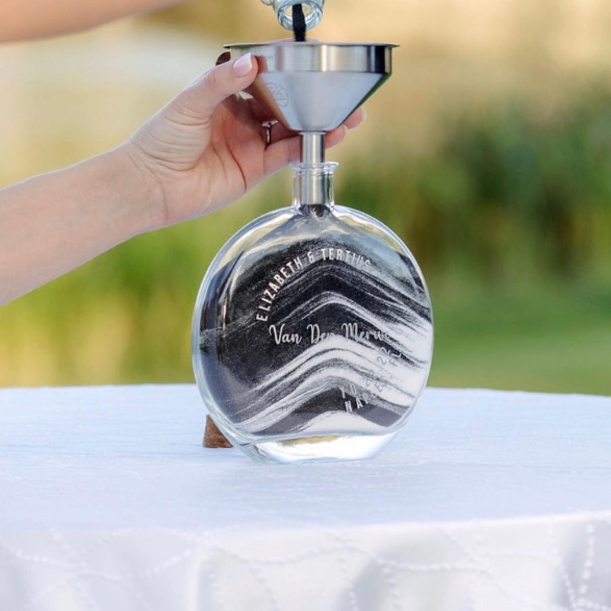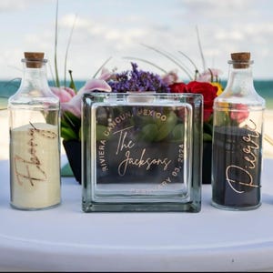 - Glass Block: The 6x6" glass block for the sand ceremony sets hold 2 lb. 13 oz. of sand to be completely filled.
