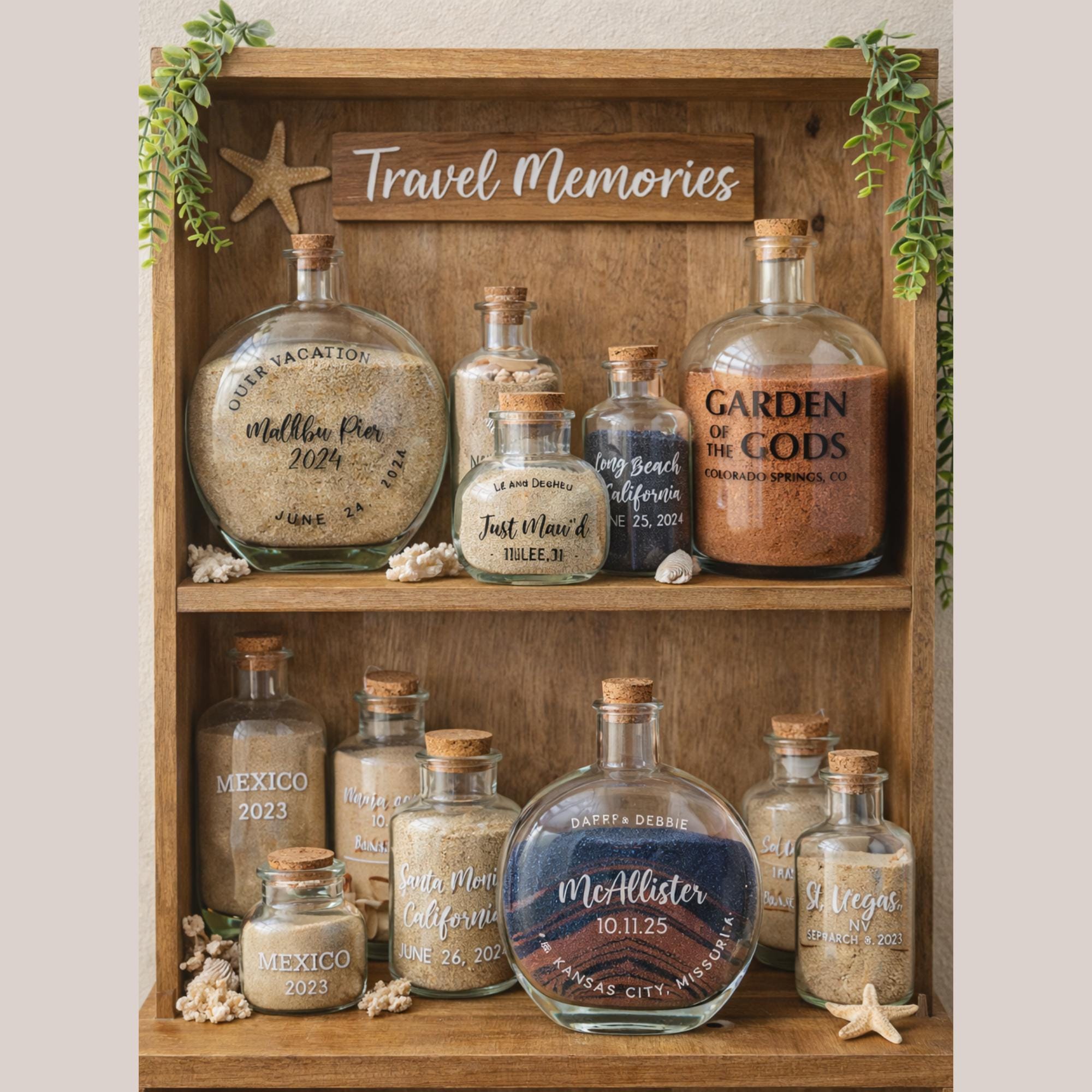 This custom glass bottle is designed to hold sand collected from meaningful places — whether it's the beach where you got engaged, your honeymoon destination, or a special vacation you want to remember forever.