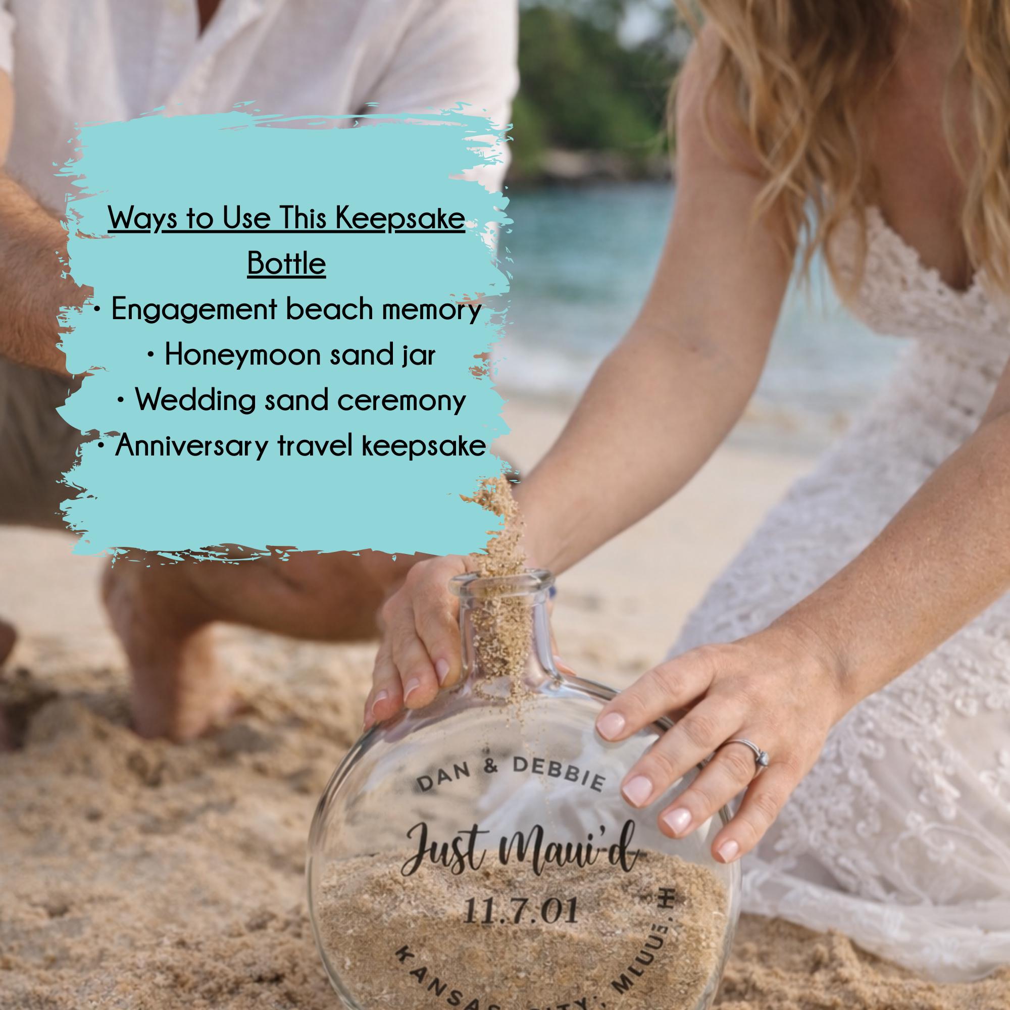 Capture the sand from your engagement trip, honeymoon, or beach wedding with this personalized sand keepsake bottle. A beautiful way to preserve your memories forever.
