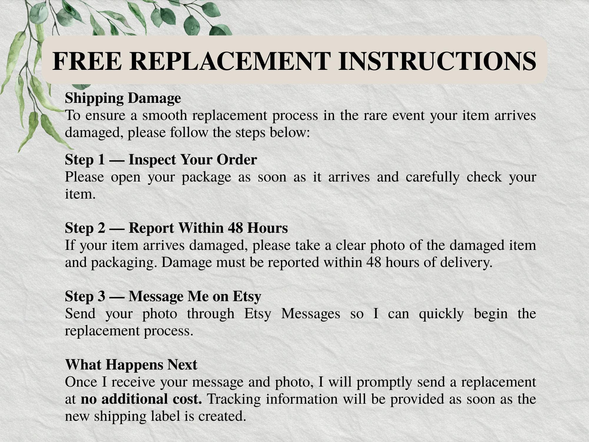 For damaged items during transit: Take pictures of the damage. Send us the pictures within 7 days of receiving your order along with your order number to our Etsy account or email: patriciasantosinc at gmail.com. A replacement will be send and shipped within 48-72 hours of notification.