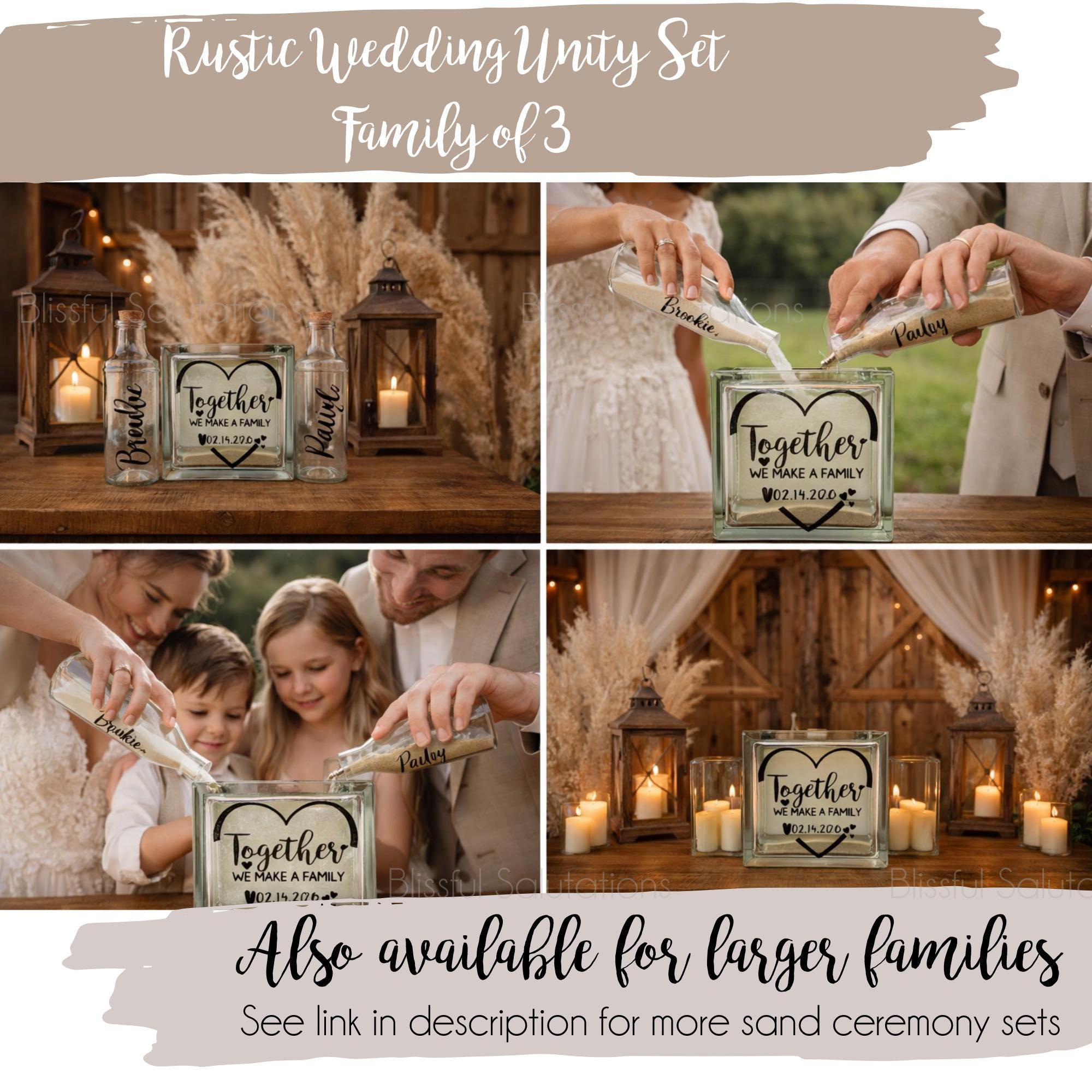 Rustic Barn Wedding Sand Ceremony Set, Personalized Unity Sand Ceremony Kit, Blended Family Wedding Sand Pouring Keepsake, Family of 3