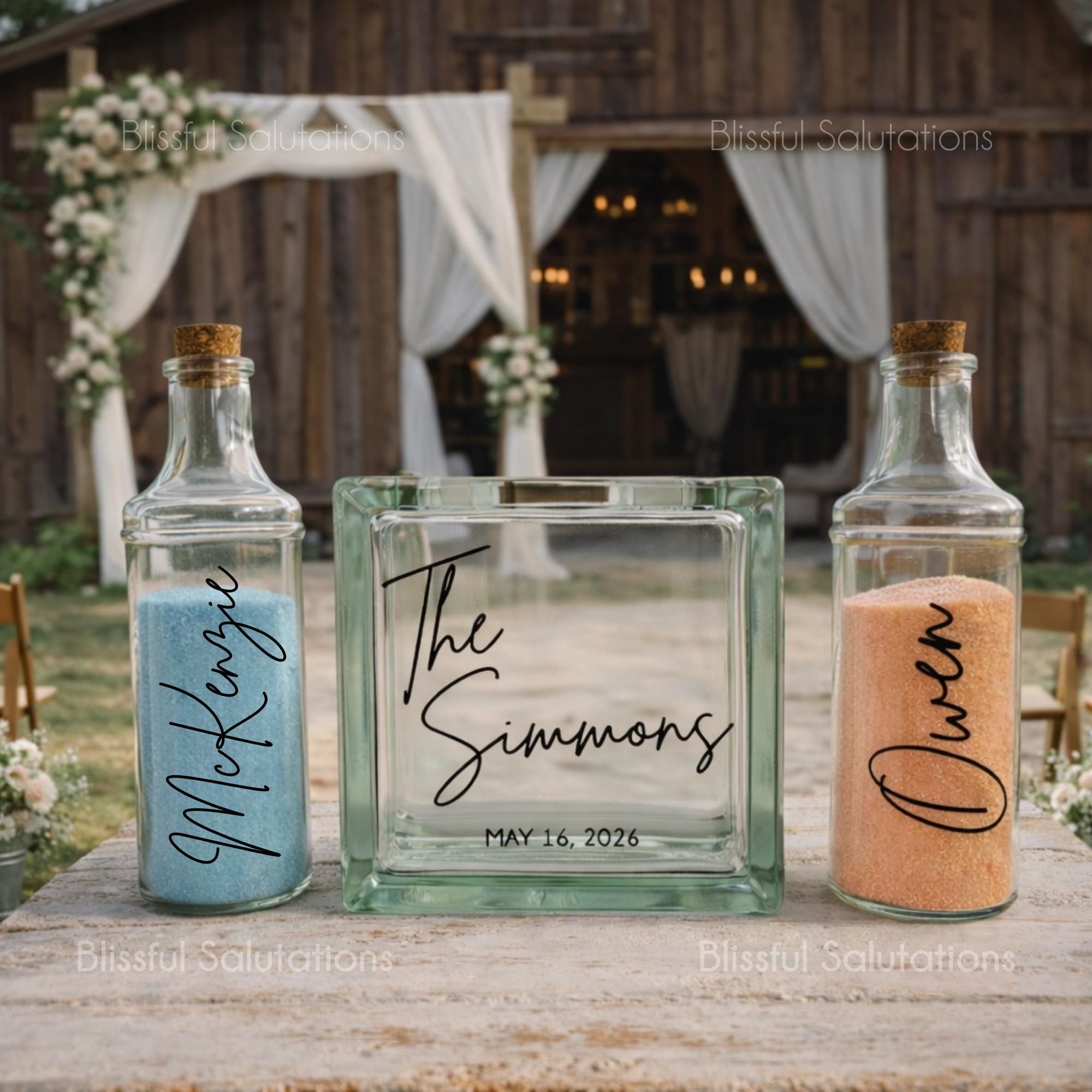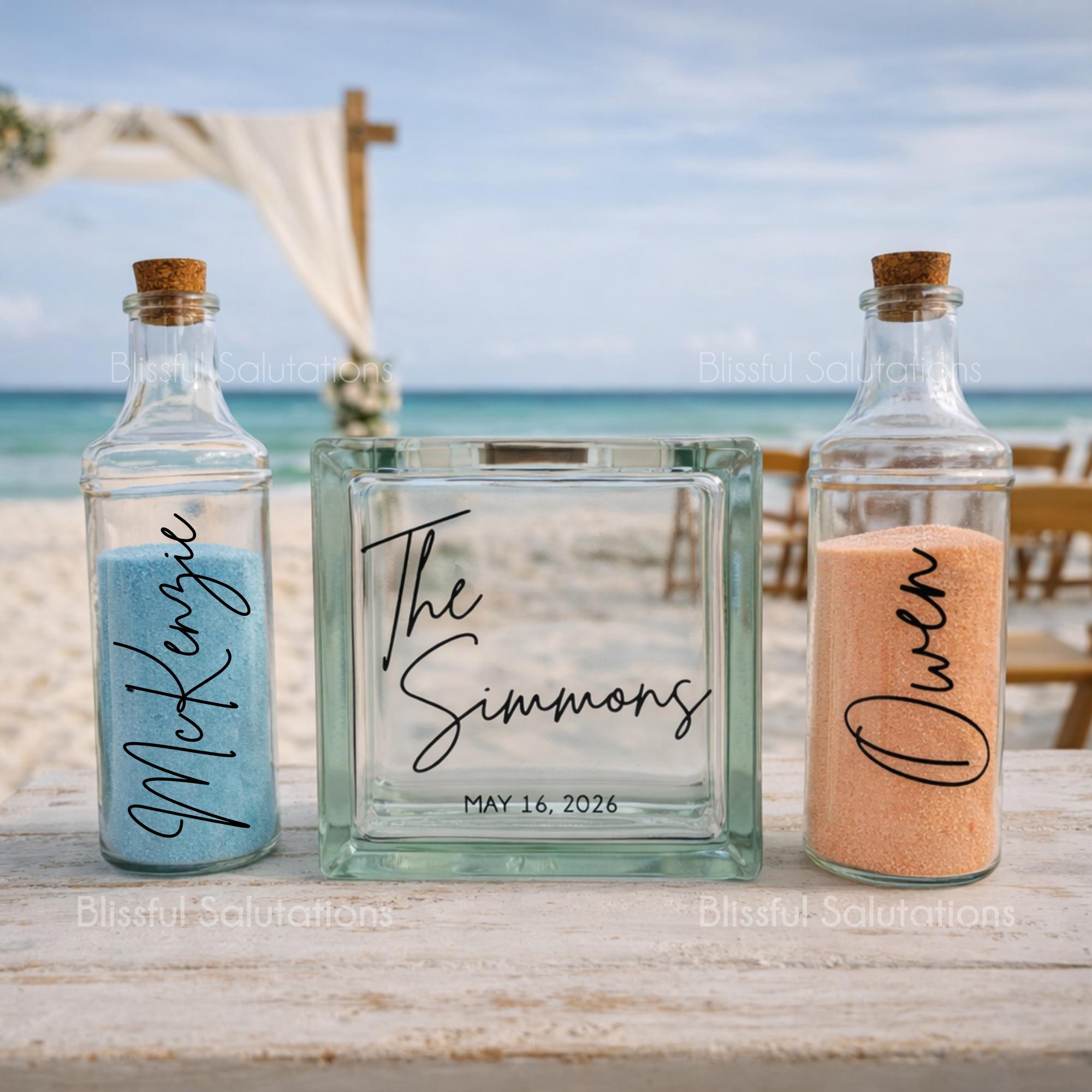 Our custom wedding sand ceremony set also makes a beautiful wedding keepsake display long after the ceremony. Couples often use it to remember their beach wedding, destination wedding, engagement, honeymoon, or vow renewal ceremony. Whether you are planning a traditional wedding, rustic barn wedding, or blended family unity ceremony, this personalized sand ceremony bottle set becomes a lasting reminder of the moment two lives were joined together.